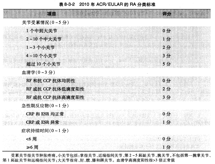 2010年2010年ACR/EULAR发布的分类标准,加入了实验室检测项目,其敏感度为72.3%,特异度为83.2%。6分及以上肯定类风湿性关节炎RA的诊断。