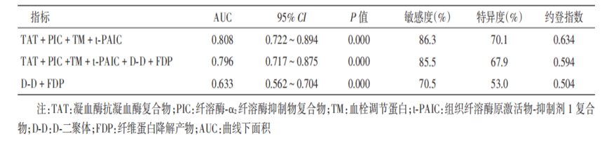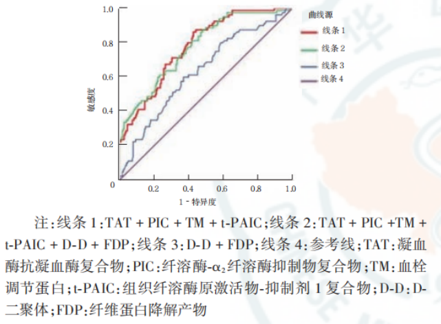 TAT+PIC+TM+t-PAIC、TAT+PIC+TM+t-PAIC+D-D+FDP诊断恶性肿瘤患者静脉血栓形成的AUC明显高于D-D+FDP(0.808和0.796比0.633),见表1、图2。