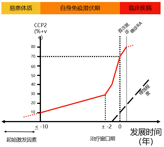 RA患者发病前10年即可检测出抗CCP抗体,有助于RA的早期诊断。