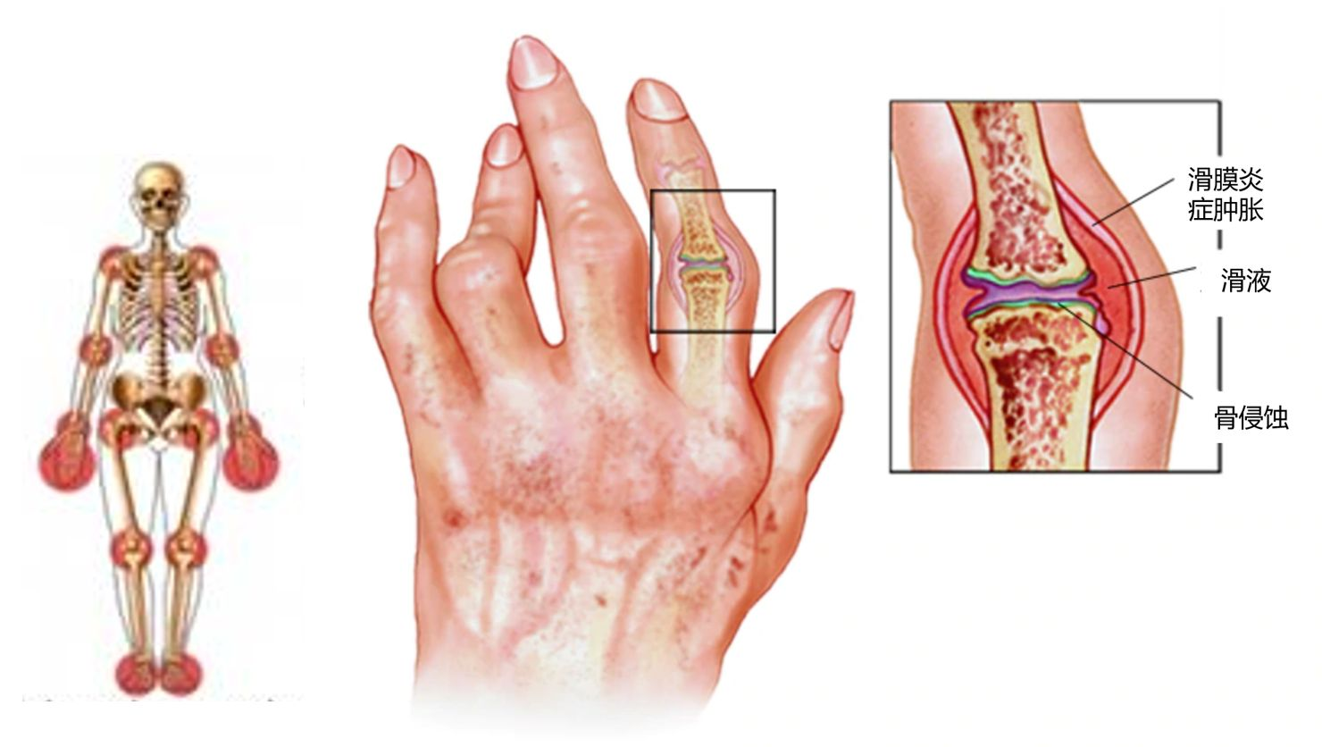 类风湿关节炎(RA:rheumatoid arthritis):是一种原因不明的侵蚀性、对称性多关节炎为主要临床表现的慢性、全身性自身免疫性疾病。基本病理表现为滑膜炎、血管翳形成,并逐渐出现关节软骨和骨破坏,最终导致关节畸形和功能丧失。早期诊断、早期治疗至关重要。